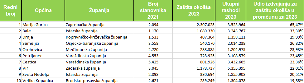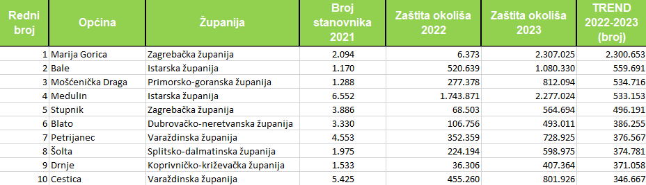 Po stanovniku najviše je unutar proračunske stavke izdvojila Marija Gorica, nešto više od 1,1 tisuću eura, nešto više od 900 eura Bale, gotovo 631 euro Mošćenička Draga, blizu 500 eura Milna, blizu 400 eura Vir, Medulin i Omišalj blizu 350 eura, Vrbnik blizu 340 eura, Šolta nešto više od 300 eura i Drnje 266 eura po stanovniku. Marija Gorica i Bale najviše su izdvojile za zaštitu okoliša, gleda li se udjel u proračunu, 65, odnosno 33 posto. Između 20 i 30 posto izdvojile su općine Drnje, Semeljci, Orehovica, Petrijanec, Cestica, Vir i Sveta Nedelja, a nešto manje od 20 posto Velika Kopanica. Marija Gorica najviše je i povećala sredstva u odnosu na 2022. godinu, u apsolutnom iznosu, za 2,3 milijuna eura. Između 500 i 600 tisuća eura sredstva su povećale općine Bale, Mošćenička Draga i Medulin, nešto manje od 500 tisuća povećala je sredstva općina Stupnik, a između 300 i 400 tisuća eura općine Blato, Petrijanec, Šolta, Drnje i Cestica. U postocima, najveći rast zabilježila je također Marija Gorica, za preko 36 tisuća posto, Radoboj je sredstva povećao za gotovo 2,2 tisuće posto, Drnje za nešto više od tisuću posto, Stupnik za nešto više od 700 posto, Lokve, Nerežišća, Sali i Vojnić između 500 i 600 posto, a nešto manje od 500 posto Bednja i Povljana.