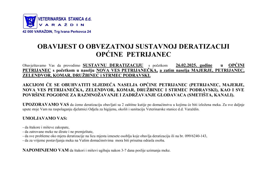 Obavještavamo Vas da provodimo SUSTAVNU DERATIZACIJU s početkom 26.02.2025. godine u OPĆINI PETRIJANEC s početkom u naselju NOVA VES PETRIJANEČKA, a zatim naselja MAJERJE, PETRIJANEC, ZELENDVOR, KOMAR, DRUŽBINEC i STRMEC PODRAVSKI.