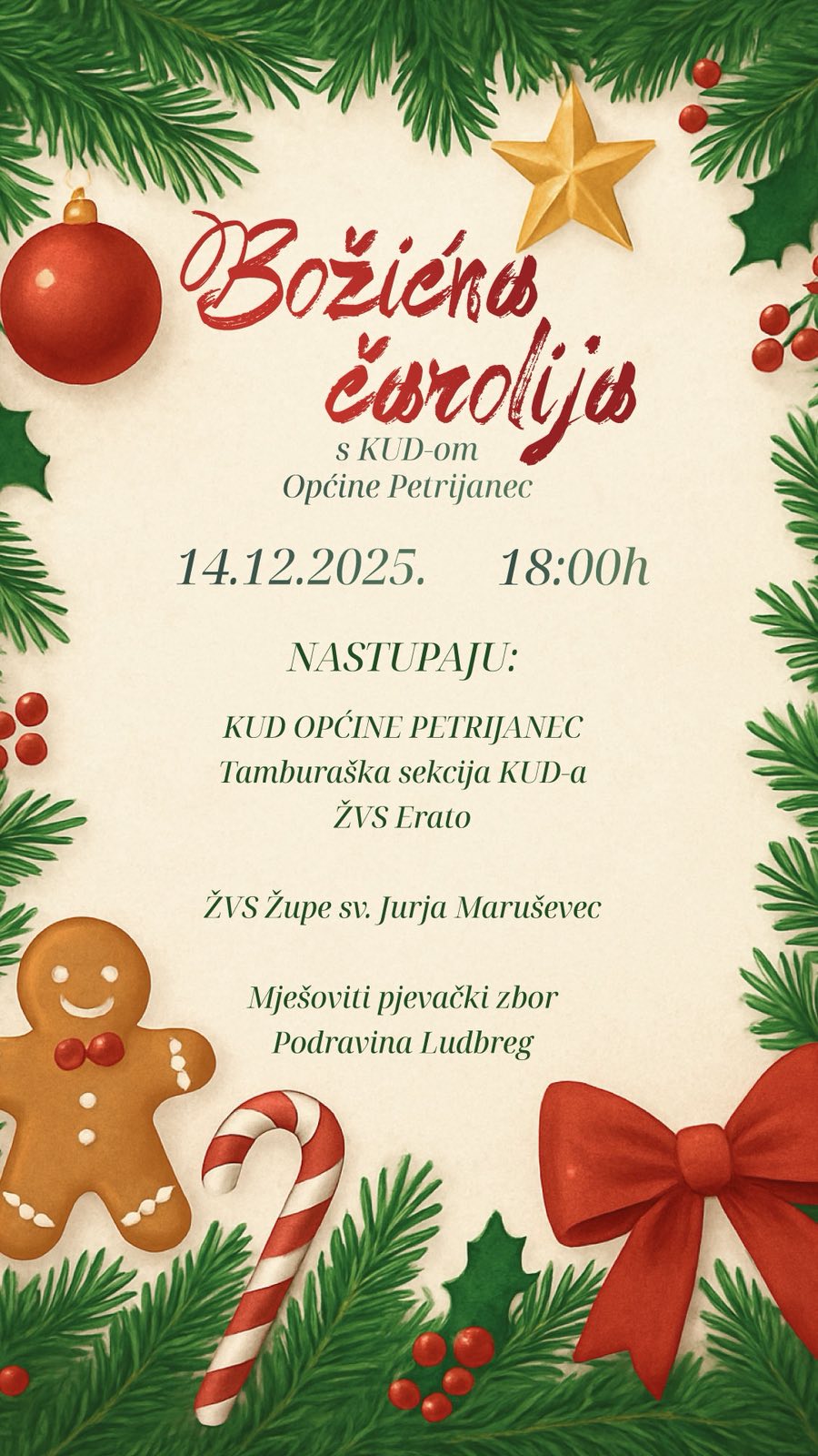Posjetitelje očekuje večer ispunjena tradicionalnim božićnim napjevima, toplom blagdanskom atmosferom i glazbom koja povezuje zajednicu u duhu nadolazećih blagdana.