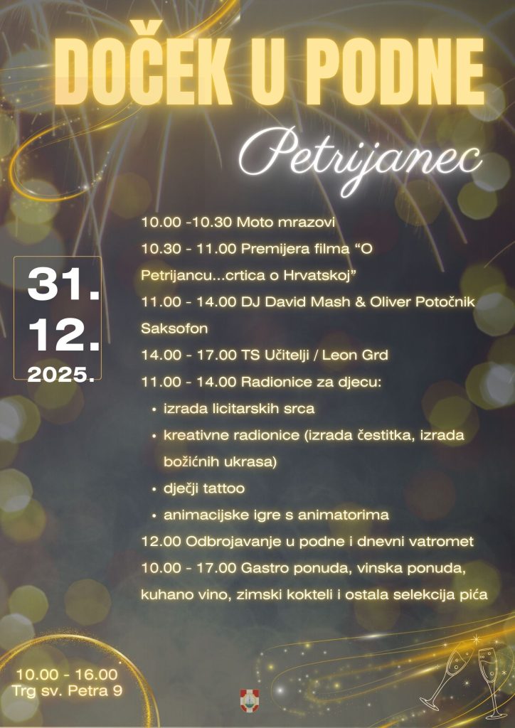 Doček Nove godine u ponoć je klasika, ali Petrijanec ove godine nudi još bolju ideju: ispratiti staru godinu već u podne– uz odličnu glazbu, sadržaj za djecu, blagdansku gastro ponudu i atrakcije koje će podići atmosferu od jutra do ranog poslijepodneva. Doček u podne zamišljen je kao opušteno i veselo druženje za sve generacije – dovoljno razigrano za najmlađe i dovoljno “dočekasto” za odrasle.