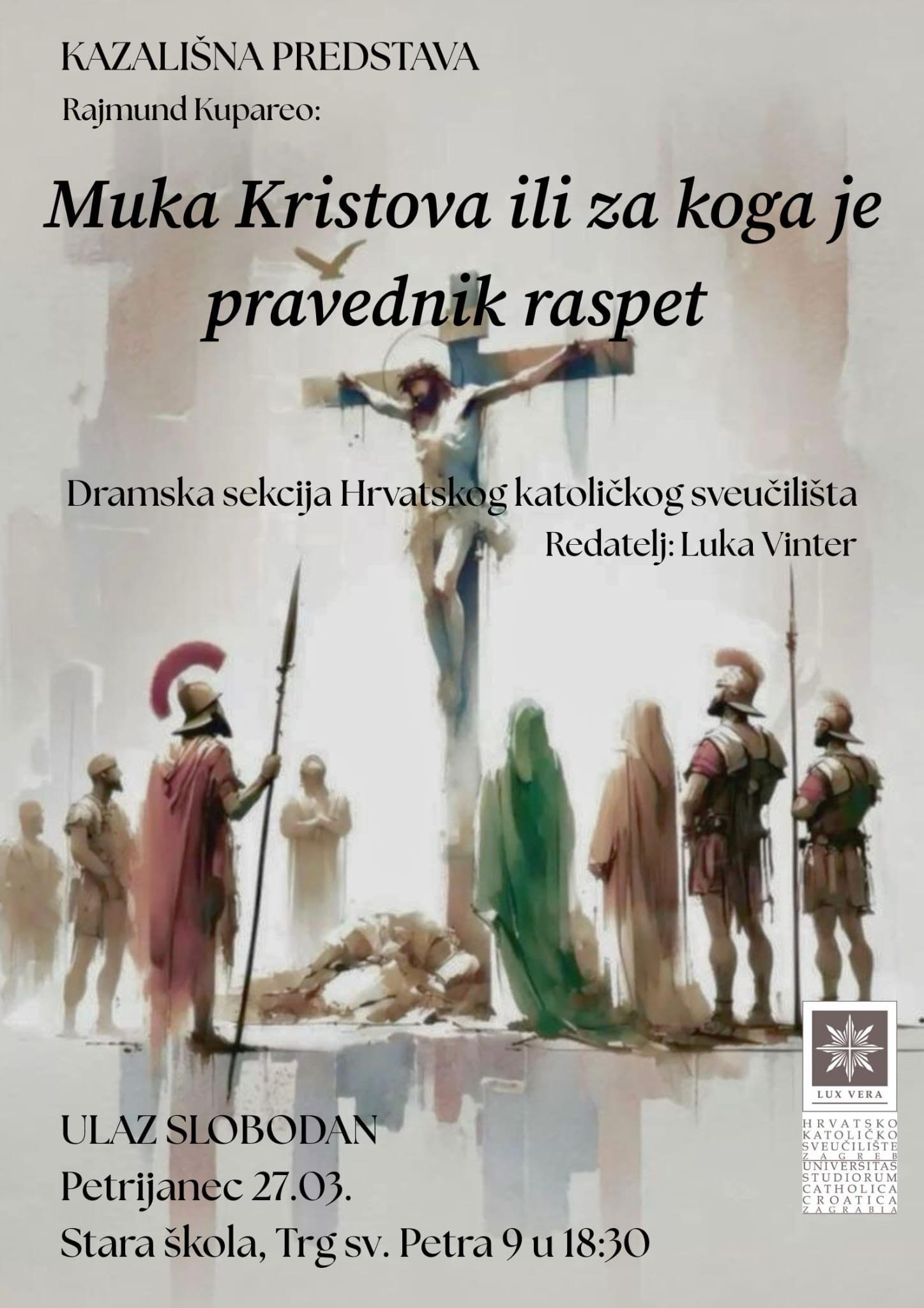 Premijerna izvedba dramske predstave „Muka Kristova ili za koga je pravednik razapet“ hrvatskog dramatičara Rajmunda Kuparea u izvedbi Dramske sekcije Hrvatskog katoličkog sveučilišta u Zagrebu a pod redateljstvom studenta i umjetničkog voditelja Dramske sekcije, Luke Vintera održana je u Auli Magni Hrvatskog katoličkog sveučilišta. Već 27.ožujka 2026. godine s početkom u 18:30 sati imati ćemo priliku u Staroj školi vidjeti ovu divnu predstavu.